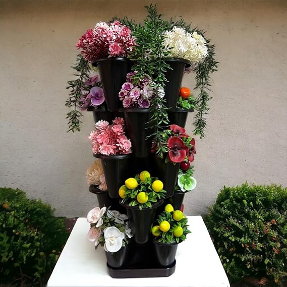 Katlı Şanslı Yonca Kule Saksı Seti Çiçek Bitki Sebze Meyve Salon Mutfak Banyo Bahçe Saksı Seti (Siyah)