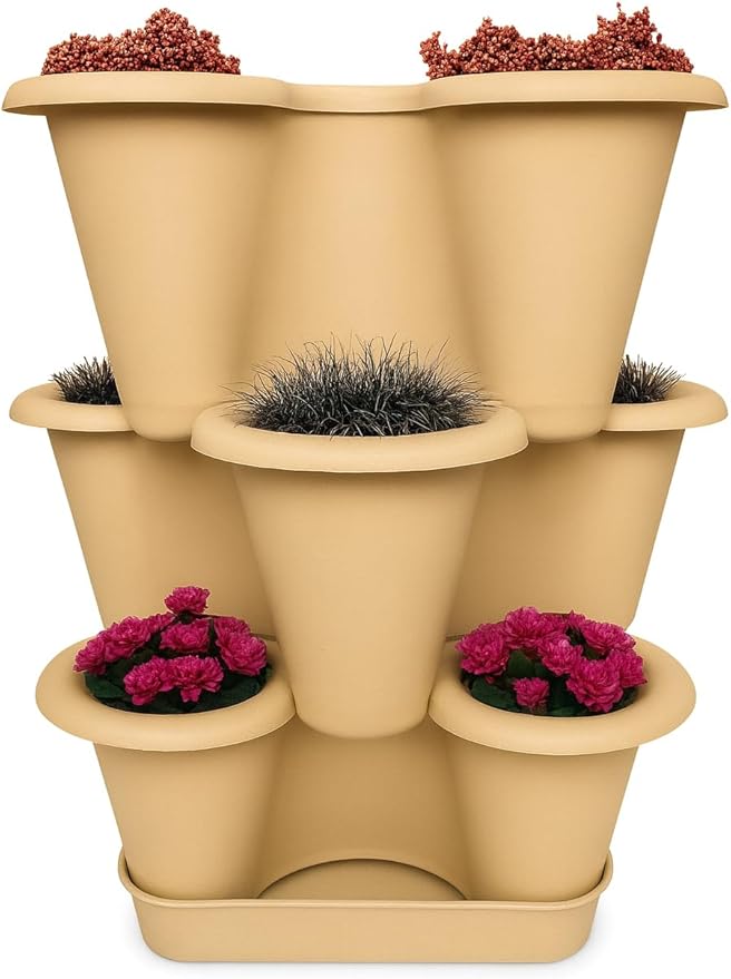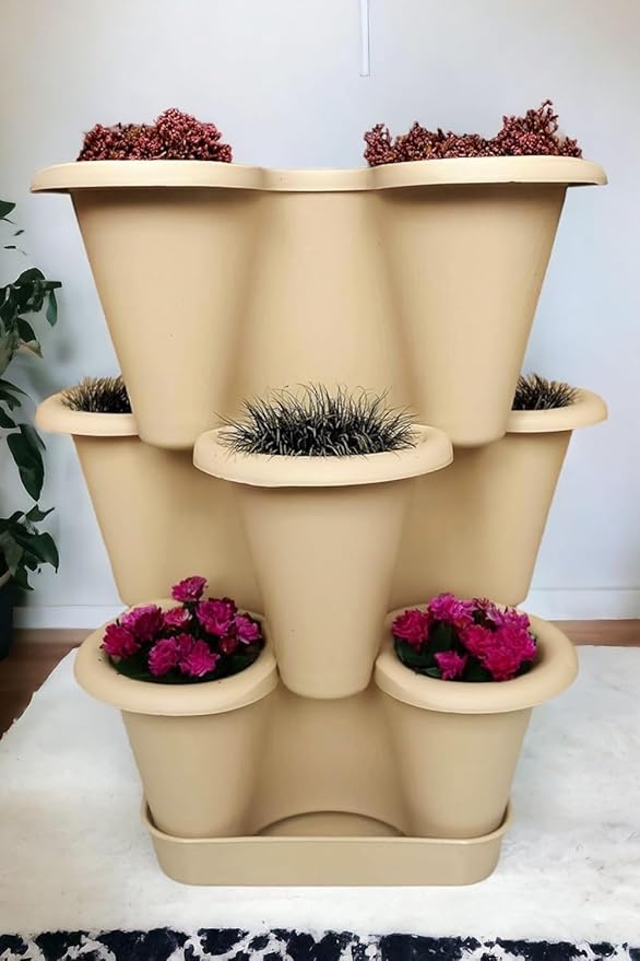 TASARIM: Yonca şeklinde tasarlanmış 3 katlı saksı seti, üst üste konulabilen modüler yapısı ile dekoratif bir görünüm sunar