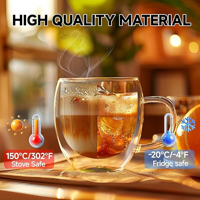 【ÇİFT DUVAR TASARIMI】 – Bu cam kahve,çay,limonata vs. kupalarının tasarımı, çift katmanlı teknolojiyi kullanır. İç katman ısındığında, dış katman ısınmaz, elinizi yanmaktan korurken ,içeceğin sıcaklığını uzun süre muhafaza eder.