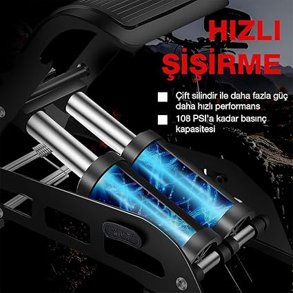 108 PSI / 7.5 bar şişirme gücü ile otomobil, motosiklet, cip, karavan ve bisiklet lastikleri, toplar, balon, lastik bot ve yatak şişirmek için uygundur