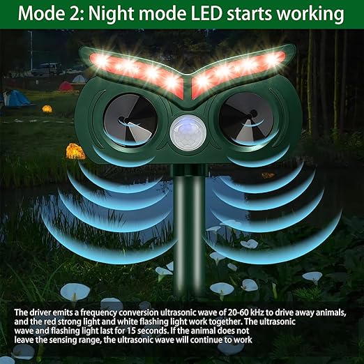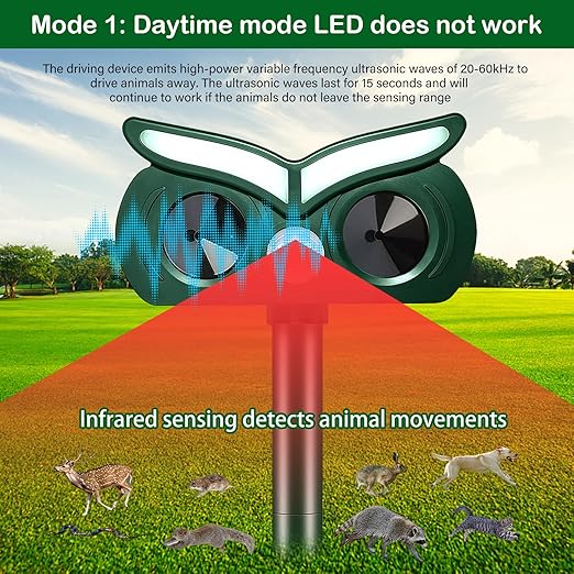 【2 mod】Gün modu: 20 kHz ila 60 kHz ultrasonik dalgalar kullanılır. Gece modu: 20 kHz-60 kHz ultrason + uyarı kırmızı ışık. Modu manuel olarak değiştirmeniz gerekmez, cihaz otomatik olarak bir ışık sensörü üzerinden algılar.