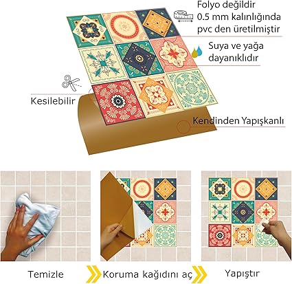 Satın almadan önce bize genişlik ve yükseklik santim ölçünüzü söylerseniz kaç adet almanız gerektiğini söyleyebiliriz. ÜRÜN BİLGİLERİ 0,36 m2 alımlar da 4 adet olarak gönderilmektedir. 1 m2 alımlar da 11 adet olarak gönderilmektedir. 5 m2 alımlar da 56 adet olarak gönderilmektedir. Ustaya ihtiyaç duymadan, kırmadan dökmeden yaşam alanlarınızı yeniden yaratın. Desenli pvc karo sticker, folyo veya etiket değildir. 0,5 mm. KALINLIKTA, çevre dostu pvc üzerine UV baskı yapılarak Türkiye’de üretilmiştir. Seramik, fayans, mdf-lam, laminant parke, metal, mermer gibi pürüzsüz yüzeyi olan her malzeme üzerine yapıştırılır. Her türlü yüzey temizleyici ile temizlenebilir.