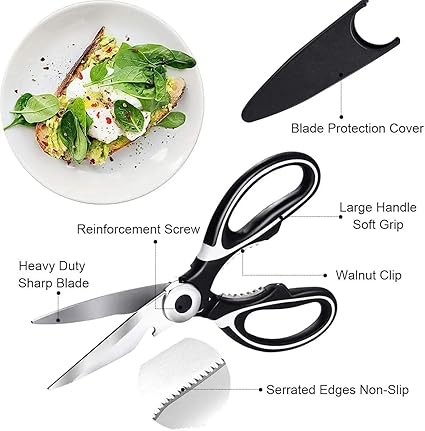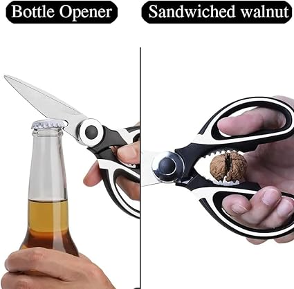 Mutfak makası, çeşitli mutfak görevleri için kaymaz kesim sağlayan mikro tırtıklı bıçak kenarlarına sahiptir. Sert sızdırmaz şişeleri açmak ve hatta fındıkları kırmak için kolay kavranan saptaki tırtıklı bölüm! Ayrıca, şişelerin ve kavanozların hızlı ve kolay açılması için tasarlandı.