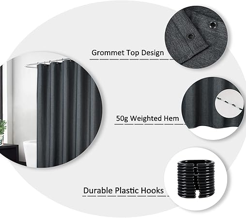 Ekstra koruma için önerilen bir astar kullanın Kolay kurulum: Sağlam ilik yapısına sahip güçlendirilmiş üst dağıtıcı başlığı, bu perdelerin asılmasını kolaylaştırır ve çeşitli uzunluklar çoğu küvet ve duşta güvenli bir şekilde oturur. (12 perde kancası dahil değildir)