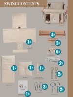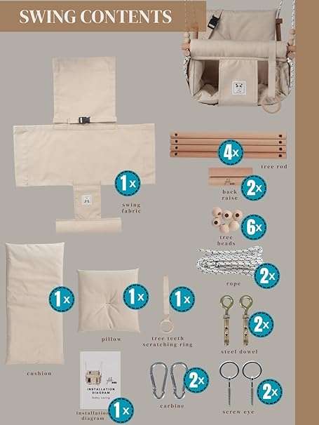 İçindekiler: Salıncak, Yastık, Yastık, 2 Çelik Dübel, 2 Karabina Kanca, 2 Vidalı Göz ve Askı Halatı.