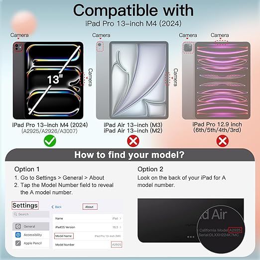 Pencil Pro/Pencil (USB-C) Destekler. iPad Pro 13 inç M4 (2024) için tasarlanmıştır. iPad Model Numaralarını Sığdır: A2925 / A2926 / A3007. Model numarasını bulmak için lütfen iPad’inizin arka alt kısmını kontrol edin