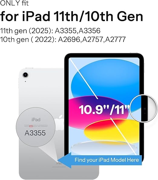 UYUMLULUK: Özellikle for iPad 11. nesil 11 inç 2025 sürümü (A16, Model: A3354, A3355, A3356) ve iPad 10. nesil 10.9 inç 2022 (Model: A2696, A2757, A2777) için tasarlanmıştır. Sipariş vermeden önce, model numarasını doğrulamak için lütfen tabletin arkasını kontrol edin.