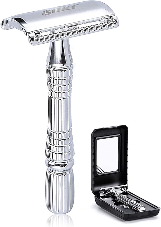 Klasik 3 Parçalı Çift Kenarlı Güvenlik Jilet Islak Tıraş Platin Bıçak ve Aynalı Seyahat Kılıfı BD176 ile Erkekler Kadınlar için