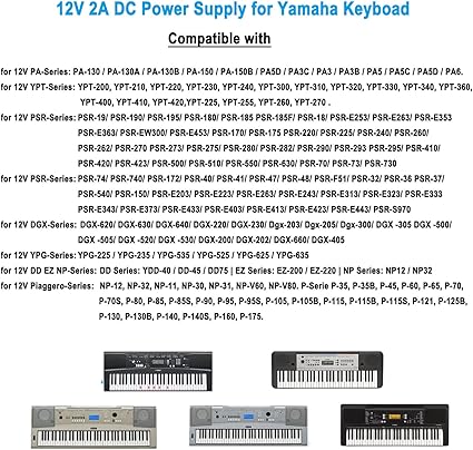 【Evrensel uyumluluk】12V 2A güç kaynağı Yamaha YPG Serisi, YPR-Serisi, YPT-Serisi, PSR Serisi, NP-Serisi, P-Serisi, EZ-Serisi ve daha fazla klavyeyle çalışır (lütfen belirli modeller için ürün açıklamasına bakın).