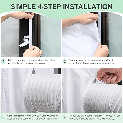 【Delmeden aletsiz montaj】 Kurulum birkaç dakika içinde aletsiz gerçekleşir: Ürünle birlikte verilen cırt cırtlı bandı pencere çerçevesine takın, contayı sabitleyin ve fermuarı hava tahliye hortumunun etrafına kapatın.