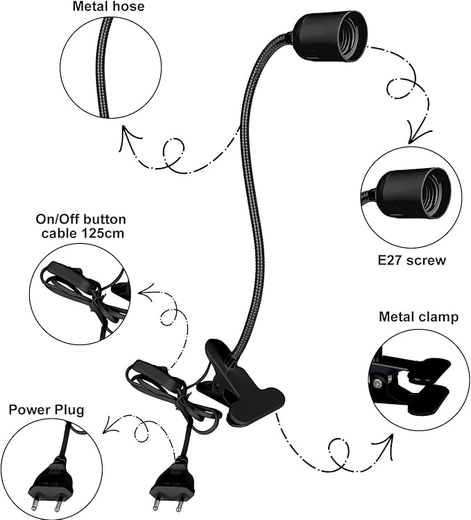 【Güçlü Klipler】E27 lamba tutucusu, masalar, raflar ve başlıklar dahil olmak üzere çok çeşitli yüzeylere güvenli bir şekilde takılabilen güçlü klipslerle donatılmıştır. Bu, mobilyalarınıza zarar vermeden gerektiğinde lambayı kolayca takmanıza ve çıkarmanıza olanak tanır.