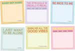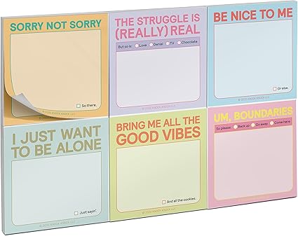 İçindekiler: Her biri yaklaşık 7 cm x 7 cm ve 40 sayfa olmak üzere altı (6) benzersiz yapışkan ped içeren bir yapışkan not paketi. Tam paket boyutları 21 x 14 cm’dir. Yapışkan not defterleri: Sorry Not Sorry, The Struggle is (Gerçekten) Real, Be Nice to Me, I Just Want to Be Alone, Bring Me All the Good Vibes, Um, Boundaries