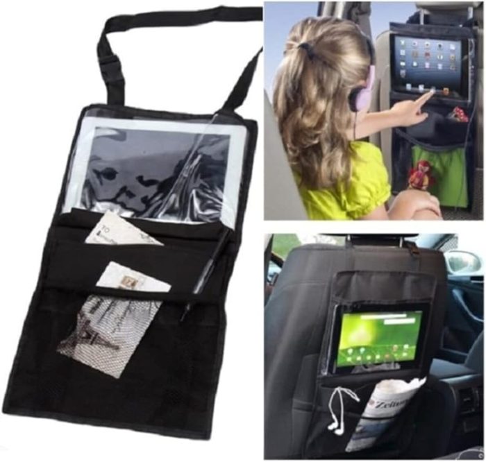 Şeffaf bölmeye telefon veya tablet konulabilmektedir. Otomobil koltuk arkası düzenleyici İthal Sıvı Geçirmez kumaştan üretilmiştir.
