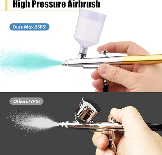 【5 Seviyeli Ayarlanabilir Hava Basıncı】 Airbrush kiti, farklı püskürtme hassasiyeti ihtiyaçlarınızı karşılamak için 5 seviyeli ayarlanabilir hava basıncını destekler. Daha yüksek basınç, geniş bir da daha ağır bir kaplamayı daha hızlı bir şekilde sunabilir.