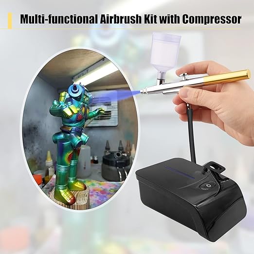 【Kompresörlü Airbrush Kiti】 Kompresörlü airbrush kiti maks. 25PSI hava basıncı ve en yüksek hava akışı 10L/dk’ya ulaşır. güç adaptörüyle çalışan airbrush kiti, uzun süre kullanımdan sonra istikrarlı bir a sahip olacaktır.