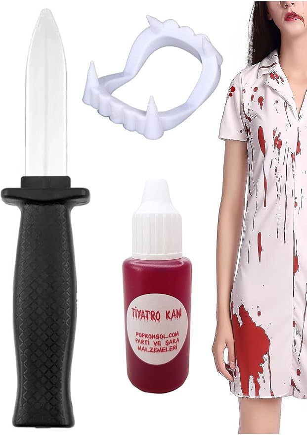 KONSOL Şaka Bıçak Yapay Kan Vampir Dişi Set Tiyatro Kanı Cadılar Bayramı Şaka Malzemesi Beyaz PP192501