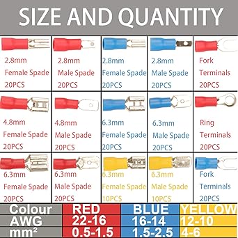 [Mükemmel malzemeler ve 3 renk tanımlama] Bakır + PVC + Tenekeden yapılmış bu kıvrımlı konektörler. Kablo aralığı: AWG 22-16 (kırmızı), AWG 16-14 (mavi), AWG 12-10 (sarı)