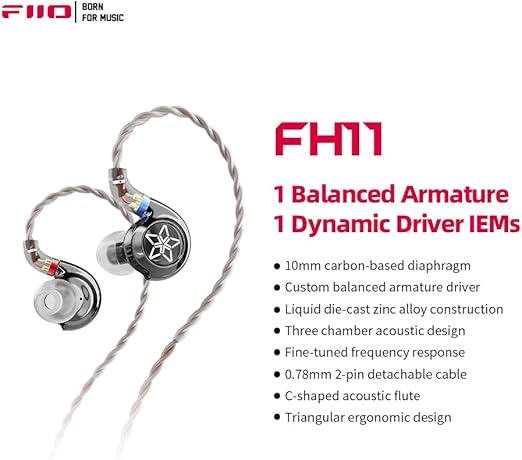 İnce ayarlanmış frekans tepkisi – Bazıları FH11’deki dengeli armatür ile dinamik sürücü arasındaki tutarlılık konusunda endişe duyabilir. Bununla birlikte, FiiO’nun mühendislik ekibi, sürücülerin pürüzsüz, dinlemesi kolay bir ses üretmek için birlikte çalışmasını sağlamak için büyük çaba sarf etti. Karbon tabanlı dinamik sürücü, müziğinize sürükleyici bir atmosfer veren güçlü bas sesleri sunar. Yüksek frekanslar, 14kHz ve 18kHz gibi belirli noktalarda özel olarak ayarlanmış aksanlara sahip özel olarak optimize edilmiş bir armatür sürücüsü tarafından yönetilir ve flüt, ksilofon ve zil gibi enstrümanların parlaklığını net bir şekilde deneyimlemenizi sağlar.