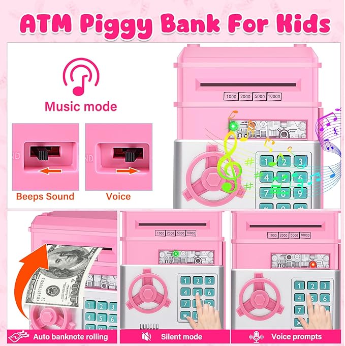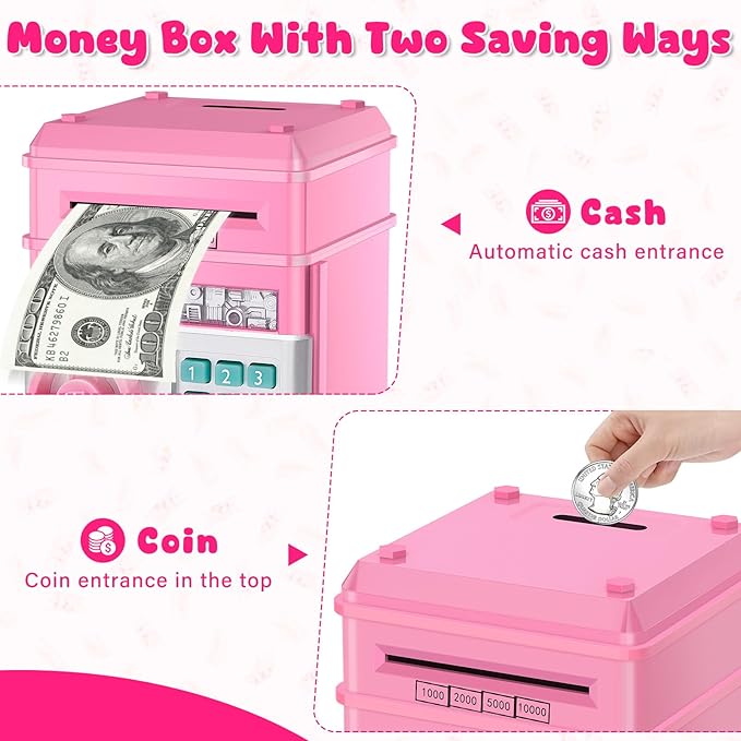 【2 çeşit depolama girişli çocuk kumbarası】① Madeni paralar üstteki yarıktan atılır. ② Banknotları ön taraftaki bozuk para yuvasından yatırın. Kağıt paralar yuvaya atıldığında, otomatik olarak ATM’nin kumbara kasasına yuvarlanır. Koşulsuz 365 günlük iade hakkı ve ömür boyu garanti sunuyoruz. Herhangi bir sorunuz varsa, bizimle iletişime geçebilirsiniz, profesyonel müşteri hizmetlerimiz sorununuzu 24 saat içinde çözecektir.