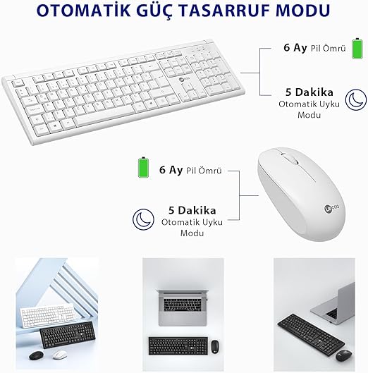 KW200 Kablosuz Türkçe Q Klavye & Mouse Set – QWERTY Türkçe Dizilim Klavye, 1200DPI Optik Fare, Win/Mac Uyumlu, Sıvı Dökülmesine Dayanıklı, Tam Boyutlu Türkçe Q Klavye Mouse Seti Beyaz