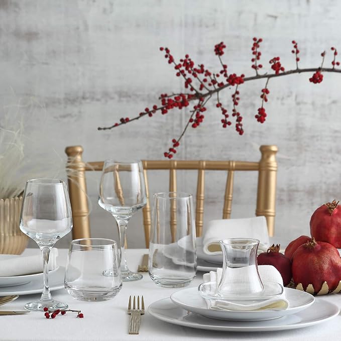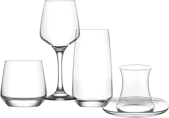 6 adet Lal Çay Bardağı, 6 adet Zen Çay Tabağı, 6 adet Lal Şarap Kadehi, 6 adet Lal Meşrubat Bardağı, 6 adet Lal Viski Bardağı
