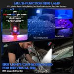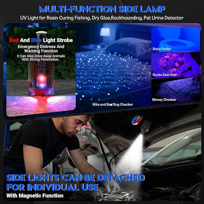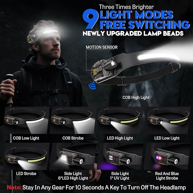 Tüm senaryolar için 9 ışık modu, çıkarılabilir ve çok yönlü kullanılabilir: LED alın lambası, UV mor ışık ve kırmızı ve mavi ışık dahil 9 ışık modu sunar. Yan lambalar mıknatıs fonksiyonu sayesinde çıkarılabilir ve tek tek kullanılabilir. Ayrıca alın lambası bir anahtarlık ile teslim edilir – her zaman ve her yerde sırt çantanıza sabitleyin. Çıkarılabilir kafa lambası ile iç ve dış mekan aktivitelerinde kullanım için sorun değil, özellikle araba onarımlarında, kendin yap işlerinde veya acil durumlarda vs. Uyarı: 10 saniye boyunca herhangi bir modda kalırsanız, alın lambası bir tuşa basarak kapanır