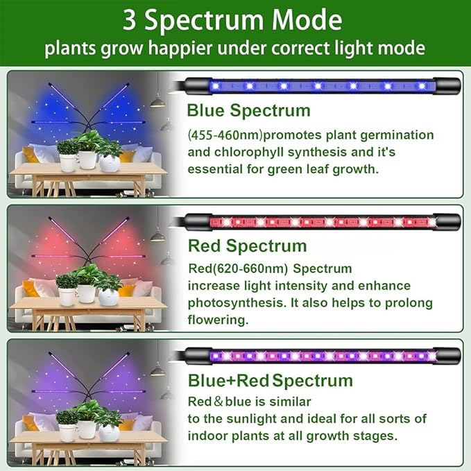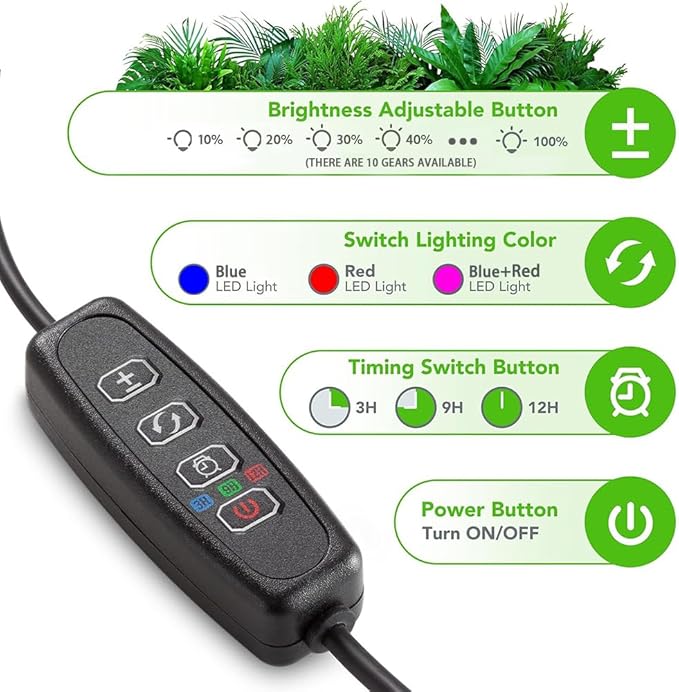 【3/9/12 saat zamanlayıcı】LED tam spektrumlu bitki lambası, bitkinizin günlük gereksinimlerine göre 3/9/12 saate ayarlanabilir. Bitki büyüme ışığı ayarlarınıza göre her gün yanar, bu da evde kalmadığınız zamanlarda bitkilerinizin bakımını iyi yapar. DİKKAT: Bu zamanlama fonksiyonu 24 saat döngüsü zamanlamasıdır. Sürekli güç kaynağında döngü çalışır ve kapatıldıktan sonra geçersizdir.