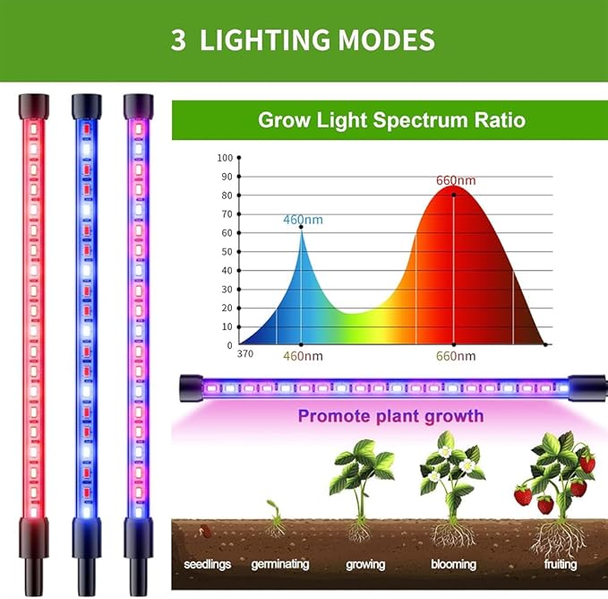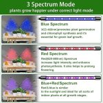 【3 aydınlatma modu】 Bitki ışığı oda bitkileri kırmızı/mavi/kırmızı + mavi üç aydınlatma moduna sahiptir, mavi ışık dalga uzunluğu 455 – 460 nm, bitkilerin büyümesini kontrol edebilir, bitkinin dallarının ve gövdelerinin çok uzun ve kalın olmamasını önler. Kırmızı ışık dalga boyu 620 – 660 nm, bitki büyümesini, çiçeklenmeyi ve meyve oluşumunu destekler.