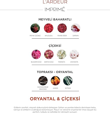 Oryantal ve Çiçeksi Büyü: Imprimé L’ardeur EDP, oryantal ve çiçeksi notalarıyla sizi tutkulu ve zarif bir koku yolculuğuna çıkarır. Feminen, sofistike ve dikkat çekici bir imza parfüm arayanlar için ideal.