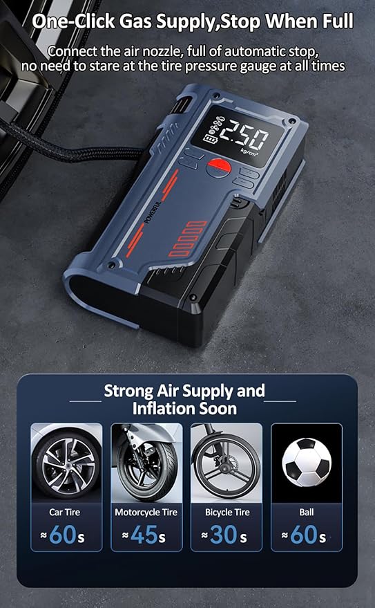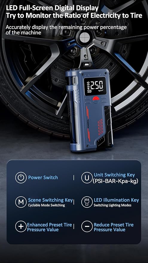 Lastik Şişirme Araba Acil Güç Takviye Marş Motoru 1000A Tepe 10000mAh Hava Pompası Pil Güçlendirici Cihaz 4.0L’ye kadar Gaz/2.5L Dizel Motorlar Saklama Çantalı Taşınabilir Güç Bankası
