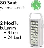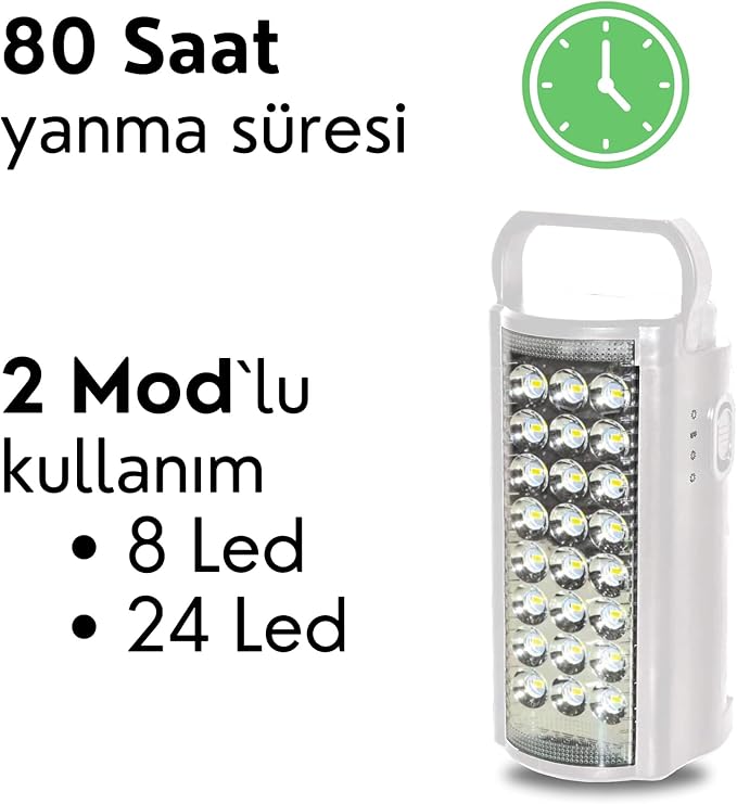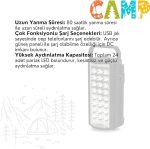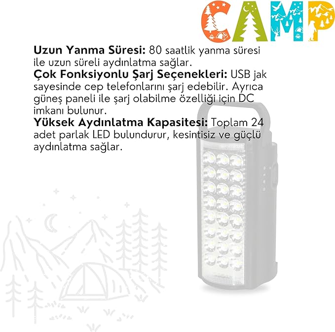 80 Saat yanma süresi, USB jak ile cep telefonu şarj imkanı, Güneş paneli için DC imkanı, 24 Adet parlak LED