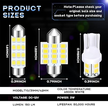 ✅【Çoklu Çıkışlarla Uyumlu】 Bu LED iç mekan yedek ampulleri, W5W, 12V, 2825, 194, 158, 168 ve daha fazlası dahil olmak üzere birden fazla çıkışla uyumludur. Dome ampuller 560, 578, 211-2 ve daha fazlası gibi soketlere uyar. Sorunsuz bir kurulum için sipariş vermeden önce soket boyutunu kontrol ettiğinizden emin olun.