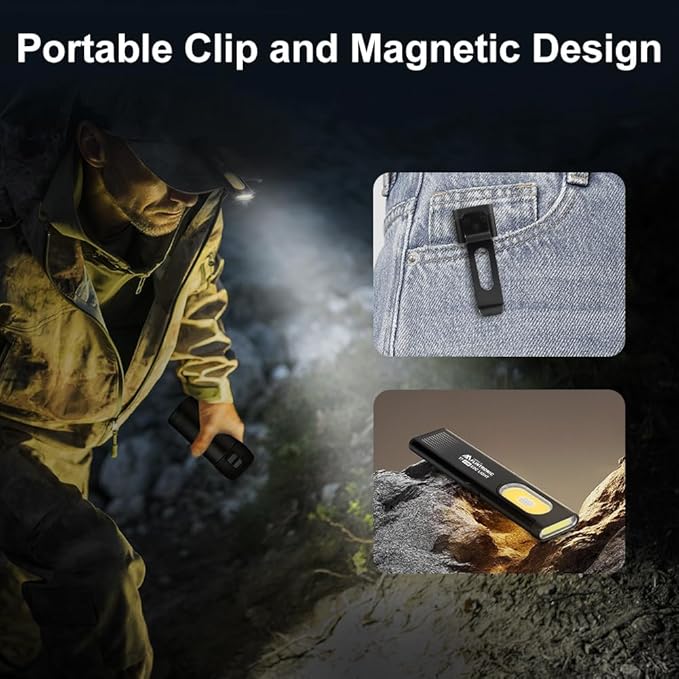 【Dahiyane tasarım】 Bu el feneri, ellerinizi serbest tutmak için manyetik tutunma ve arka klipsli tasarımı mükemmel bir şekilde birleştirir. Tabandaki güçlü mıknatıslar çalışma lambasını çalışma veya onarım sırasında otomobil, kamyon, makine vb. gibi demir içeren metal yüzeylere sabitleyebilir. Ayrıca klips tasarımı sırt çantaları, çantalar, şapkalar, kemerler ve çadırlara da kolayca sabitlenebilir.