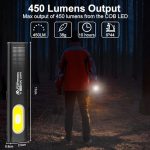 【Üstün kalite】El feneri, sağlam ve uzun ömürlü, hafif ve dokulu yüksek kaliteli alüminyum alaşımdan yapılmıştır. Silikon düğme tasarımı, taşıması kolay değildir. Dahili 450 mAh lityum pil, 10 saatlik pil ömrü sunar ve böylece güç tüketimi korkusunu azaltır. C tipi hızlı şarjı destekler ve pil seviyesini akıllı bir şekilde gösterir: Şarj sırasında kırmızı ışık her zaman yanar, tam şarj olduğunda mavi ışık her zaman yanar.