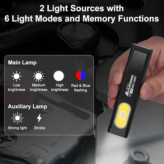 【Çok modlu aydınlatma】LED el feneri iki ışık kaynağı ile donatılmıştır: Yuvarlak COB ana ışık ve kare COB yardımcı ışık. En yüksek parlaklık 450 lümene ulaşabilir ve 4 ana ışık modu ve 2 ikincil ışık modu vardır, hepsi parlaklık ayarını destekler. Ana ışık, büyük bir yüzeyin aydınlatılmasından sorumludur ve dönüşümlü olarak kırmızı ve mavi yanıp sönen uyarı sinyallerini destekler. Ek ışık çift tıklamalı flaş koruma fonksiyonuna sahiptir.