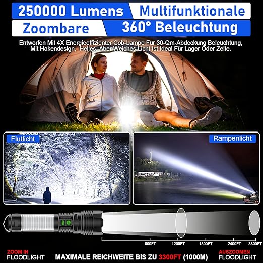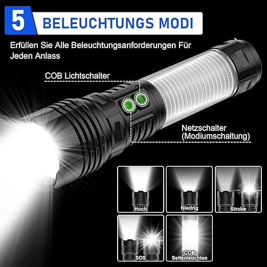 LED el feneri, şarj edilebilir, 250000 lümen LED el feneri, son derece parlak, COB yan aydınlatma ve 5000 mAh pil, 5 aydınlatma modu, IPX5 su geçirmez, dış mekan, acil durumlar/kamp/yürüyüş