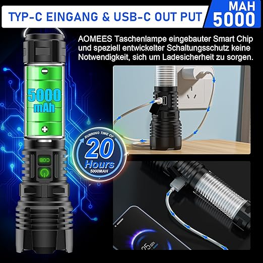 Şarj edilebilir LED el feneri: AOME-TB-D1-T5 LED el feneri, şarj süresini kısaltan ve kullanım ömrünü önemli ölçüde uzatan yeni geliştirilmiş ve tamamen geliştirilmiş bir şarj bağlantısına sahiptir. Soğuk kış aylarında bile 20 saatten fazla güçlü, solmayan aydınlatma sunar. Entegre USB bağlantısı acil durumlarda cep telefonlarını veya diğer dış mekan cihazlarını şarj etmek için de kullanılabilir.