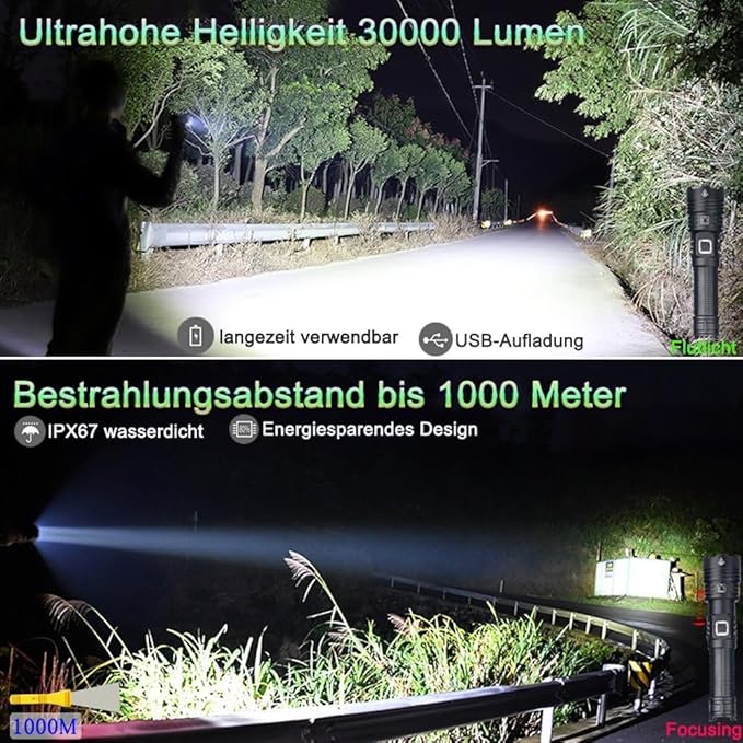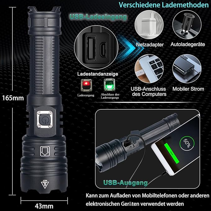 【Ultra yüksek parlaklıkta 15000 lümen & USB çıkış gücü】Işık kaynağı ABD’de en gelişmiş yüksek performanslı XHP70.2 LED, kullanır, standart CREE XML2-LED Altı kat parlaklık, kullanım ömrü 100000 saatten fazladır ve maksimum parlaklık 15000 lümene kadardır, Entegre USB çıkış arayüzü, mobil güç kaynağı olarak kullanılabilir.