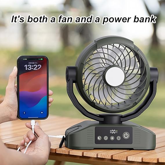 20000mAh Pil ve Güç Bankası Fonksiyonu: Dahili 20000mAh pil ile serin ve şarj olun, 9-33 saat çalışma süresi sağlar (hıza bağlı olarak) – çok günlük kamp gezileri için idealdir. Telefonları, tabletleri veya farları doğrudan fandan şarj etmek için USB bağlantı noktasını (5V/2A) kullanın, ekstra şarj cihazlarına olan ihtiyacı ortadan kaldırın