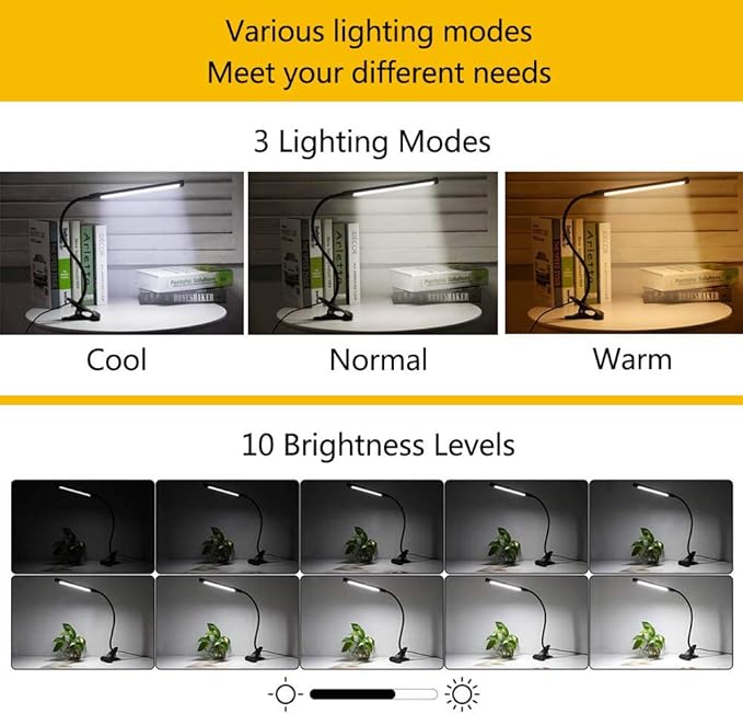 【3 aydınlatma modu ve 10 parlaklık kademesi】 Bu LED kıskaçlı lambanın 3 ışık modu vardır. Sıcak beyaz dinlenmek ve uyumak için uygundur, gün ışığı modu okumak ve öğrenmek için uygundur ve soğuk beyaz çalışma için uygundur. Aynı zamanda farklı parlaklık seviyelerini istediğiniz gibi ayarlayabilirsiniz (10 kademe: %10 – %100). Farklı ihtiyaçlarınızı karşılayın.