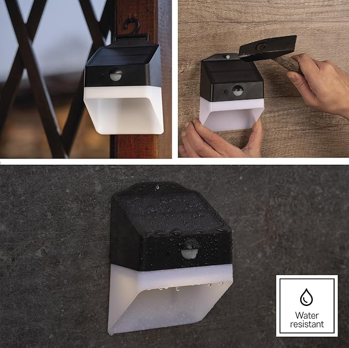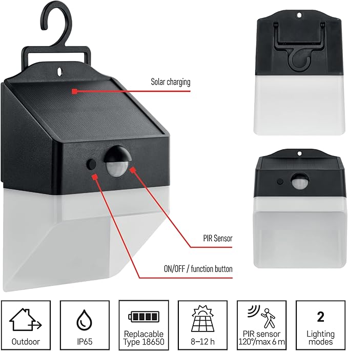 – LED Solar Lamba LUNIS Dış Mekan için Hareket Sensörlü – Ev/Bahçe için Kancalı Solar Duvar Lambası – Sensör Menzili 6 m/120° – 2 Işık Modu, Maksimum 220 lm, Nötr Beyaz – Beyaz-Siyah