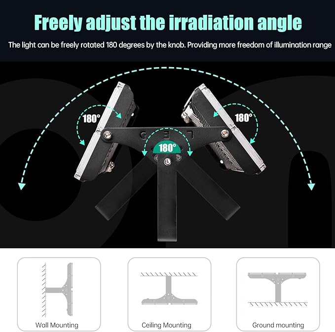 [180° Tasarım]: İyi ısı iletim performansına sahip alüminyum döküm gövde. 120° ışıma açısı, lamba gövdesi 180° ayarlanabilir veya tutucu 180° arkaya döndürülebilir, aydınlatma için zemine veya duvara veya tavana sabitlemek isteyip istemediğinizi seçebilirsiniz. Böylece daha büyük ve parlak bir aydınlatma yüzeyi yayılabilir.