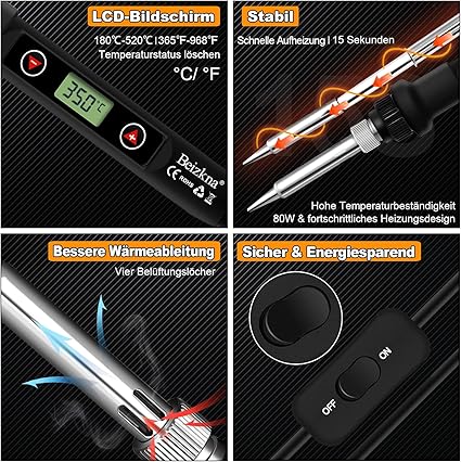 【15 S hızlı ısıtma ve verimli ısı dağılımı】80 W lehim seti seramik indüksiyon teknolojisi kullanır, havya ucu 15 saniye içinde hızlı bir şekilde ısınır, sıcaklığı sabit tutar ve enerji tüketimini azaltır. Havyadaki dört havalandırma deliği daha iyi ısı dağılımı sağlar, hızlı bir soğutma sağlar.