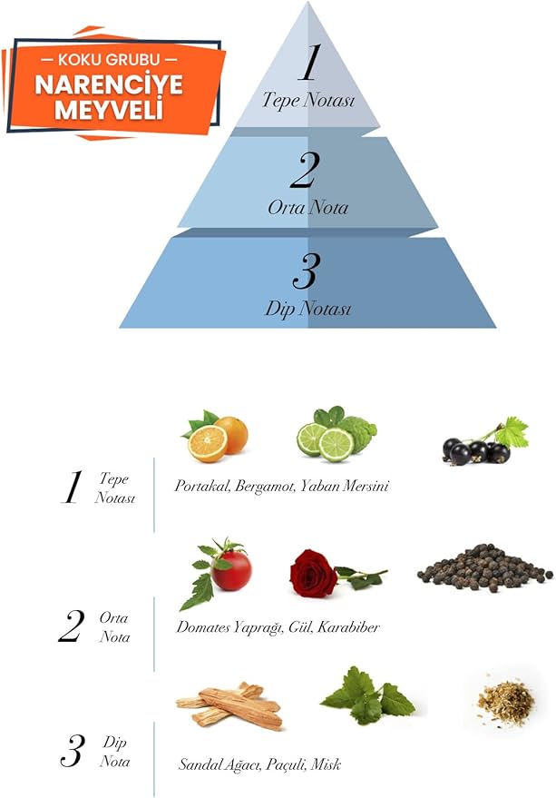 KOKU NOTALARI: EDP parfüm (Eau de Parfum) yoğunluk olarak en fazla koku veren parfümlerdir, etkisini gün boyu yanınızda hissedersiniz. Tepe notalarında portakal, bergamot ve yaban mersini bulunur. Bu notalar, parfüme taze ve enerjik bir başlangıç sağlar, ferah bir etki yaratır. Orta notalarda domates yaprakları, gül ve karabiber bulunur. Bu notalar, parfüme canlılık ve baharatlı bir dokunuş katar, aynı zamanda sofistike bir karakter sunar. Baz notalarda sandal ağacı, paçuli ve misk bulunur.