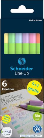 Teslimat kapsamı: 6 adet Schneider Line-Up pastel Fineliner karton kutuda, çeşitli renk seçenekleri (vanilya, nane, mavi, lila, pembe, kayısı). Hedef cinsiyet: üni. El yönü: İki elle de kullanılabilir