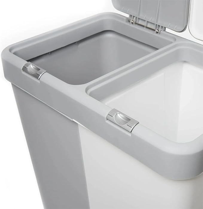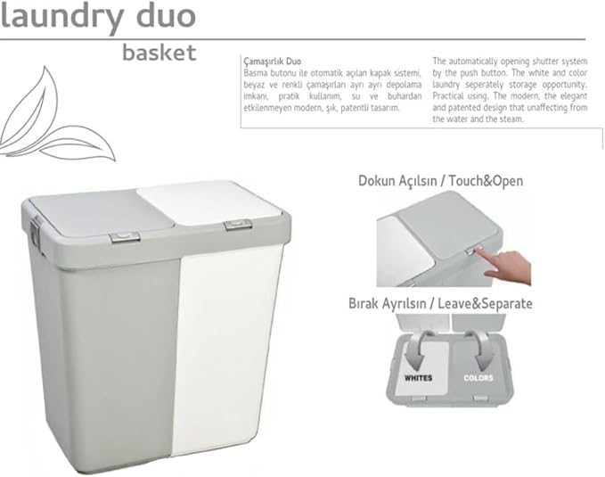 Dokunmatik düğmeli çamaşır Sepeti (gri-beyaz) 40’ar litrelik iki bölmeden oluşmaktadır.
