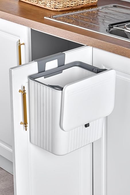 Litre Fonksiyonel Kapaklı Banyo Ve Mutfak Tezgahüstü Çöp Kovası Dolap Ve Duvar Aparatlı, Yerden Tasarruflu Lavabo Altı Veya Dolap Kapısı Için Kapasiteli Mutfak Çöp Kovası,Askılı (BEYAZ)
