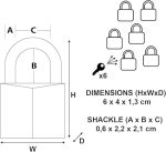 Boyutlar: Asma kilit (YxGxD) 6 x 4 x 1,3 cm; braket (AXBxC) 0,6 x 4 x 1,3 cm; braket (AXBxC) 0,6 x 4 x 1,3 cm 2,2 x 2,1 cm; 6 anahtar; 6 asma kilit