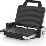 Hem kapalı kontak ızgarası hem de büyük, katlanabilir masa üstü mangal olarak mangal yapar