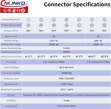 Kablo özellikleri: 0.3-0.5mm²/22-20AWG; Kablo çapı aralığı: ф3.0 ~ ф6.0mm; Kontak çapı × sayı: Φ1.0×6; dayanıklılık: ≥500 bağlantı; sıcaklık aralığı: -40° C ~ 80° C; montaj tipi: lehimleme;